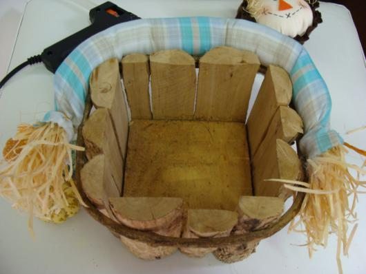 Cole o braço do espantalho ao redor do vaso de madeira utilizando a cola quente. Em seguida cole a cabeça do espantalho no meio do braço.